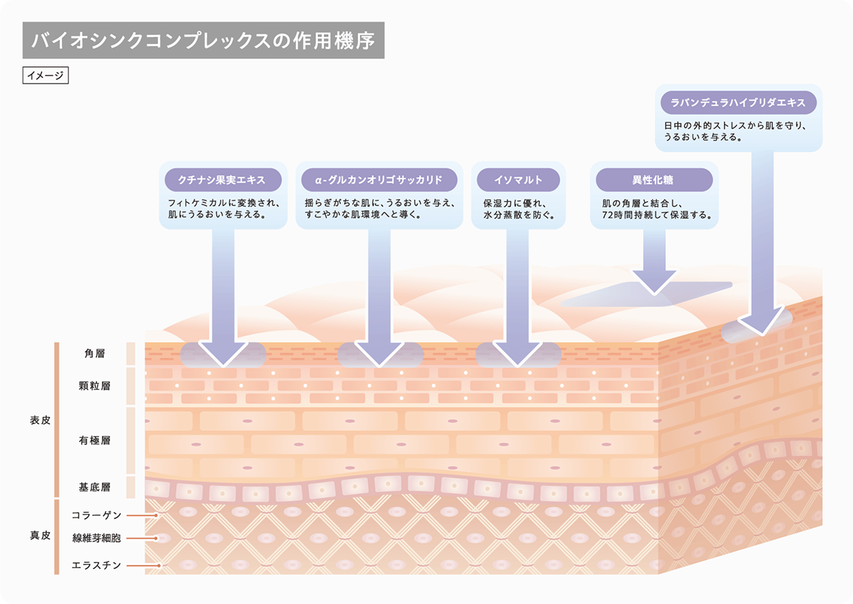 バイオシンコンプレックスを角層すみずみまでスッと浸透させ、肌にピタッと密着。